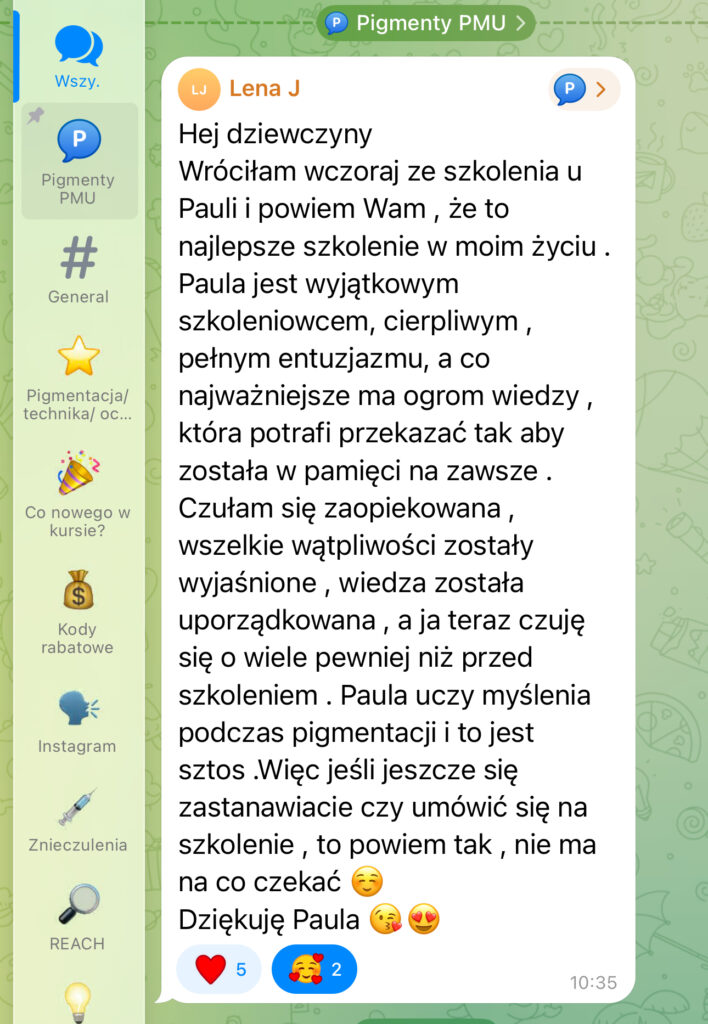 Jedyny taki hybrydowy Masterclass w Polsce: uczysz się teorii online, a potem przyjeżdżasz na indywidualny dzień szkoleniowy 1:1, tylko dla Ciebie. Nauczę Cię mojej autorskiej techniki łączenia dwóch typów pigmentów i w końcu zrozumiesz, JAK uzyskiwać przewidywalne efekty Twoich pigmentacji.