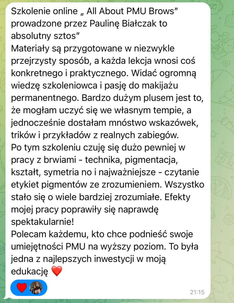 Tak, otrzymasz certyfikat szkolenia Masterclass oraz szkolenia online all about PMU brows.